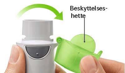 Patronen din er brukt opp. Vri på det gjennomsiktige endestykket for å løsne den. Inhalatoren er nå i låst posisjon. Trekk patronen ut av inhalatoren. Sett inn en ny patron til det høres et klikk (se trinn 2). Den nye patronen vil stikke litt mer ut enn den første patronen gjorde (fortsett med trinn 3.) Husk å vri det gjennomsiktige endestykke på plass for å låse opp inhalatoren.