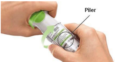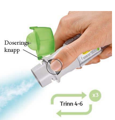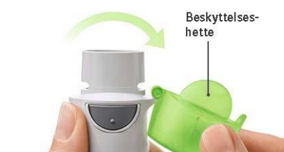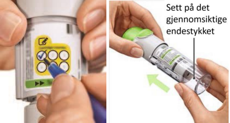 Sluttet du å vri på det gjennomsiktige endestykket før det sa “klikk”? Vri det gjennomsiktige endestykket med en kontinuerlig bevegelse til det sier “klikk” (1/2 omdreining). Doseindikatoren registrerer hver ufullstendig vridning og antall gjenværende doser reduseres.