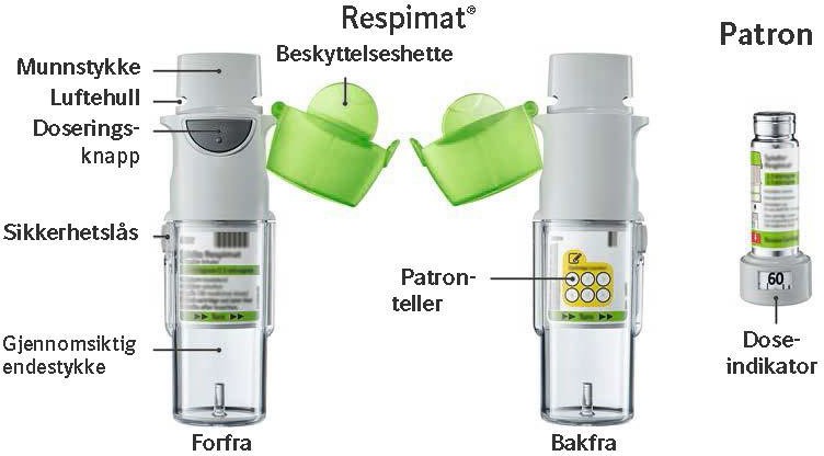 Merk: Tester har vist at Respimat gjenbruksinhalator fungerer for 540 inhalasjoner (tilsvarende 9 patroner).