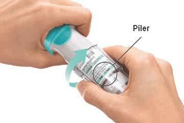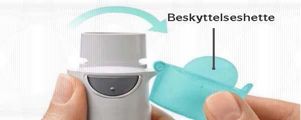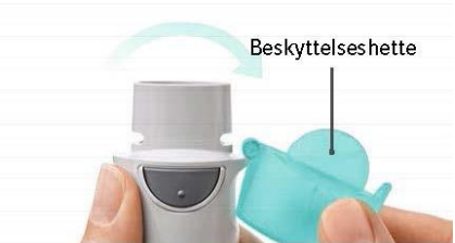 Patronen din er brukt opp. Vri på det gjennomsiktige endestykket for å løsne den. Inhalatoren er nå i låst posisjon. Trekk patronen ut av inhalatoren. Sett inn en ny patron til det høres et klikk (se trinn 2). Den nye patronen vil stikke litt mer ut enn den første patronen gjorde (fortsett med trinn 3.) Husk å vri det gjennomsiktige endestykke på plass for å låse opp inhalatoren.
