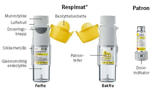Merk: Tester har vist at Respimat gjenbruksinhalator fungerer for 540 inhalasjoner (tilsvarende 9 patroner).