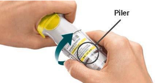 Hvis det gjennomsiktige endestykket allerede er vridd, følg trinnene «ÅPNE» og «TRYKK» under «Daglig bruk» for å ta medisinen.