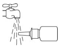 Hold flasken vannrett, og skyll pumpespissen med varmt vann mens du gnir forsiktig på spissen med fingeren eller med en ren, myk klut i 15 sekunder.