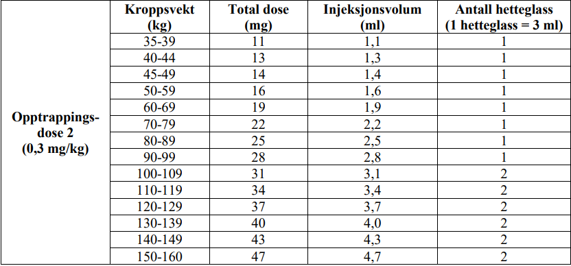 Deretter får du én "vedlikeholdsdose" på 1,5 mg for hvert kilogram kroppsvekt 2-7 dager etter andre dose.