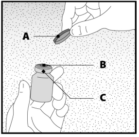 Hetteglasset er kun til engangsbruk. Innholdet i hetteglasset skal injiseres intramuskulært umiddelbart etter at det er trukket opp i sprøyten. Fjern plasthetten (A), men ikke metallringen (B) eller proppen (C).