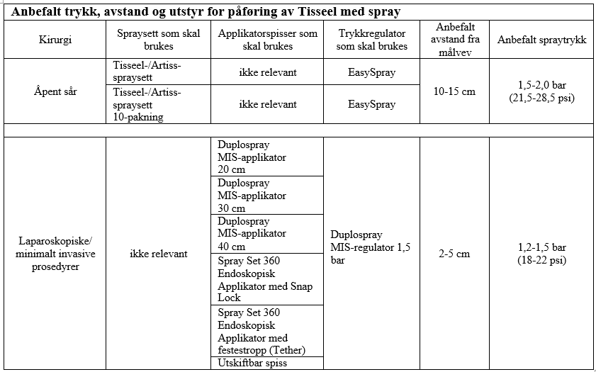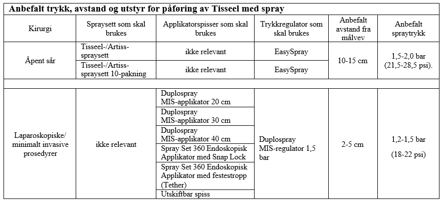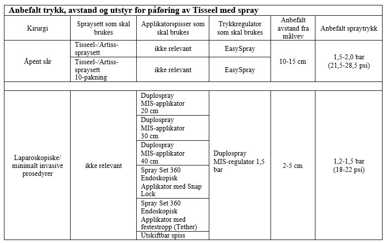 Når Tisseel påføres med sprayutstyr, må det benyttes et trykk og en avstand fra vev som er innenfor områdene som anbefales av produsenten, som følger: