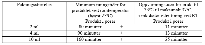 Minimum tinings-/oppvarmingstider 33°C til maksimalt 37 °C, sterilt vannbad Produkt uten poser