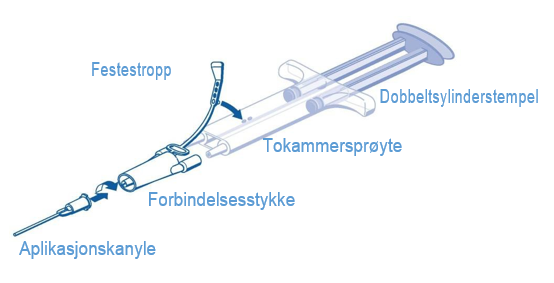Fest forbindelsesstykket til den ferdigfylte tokammersprøyten med festestroppen.