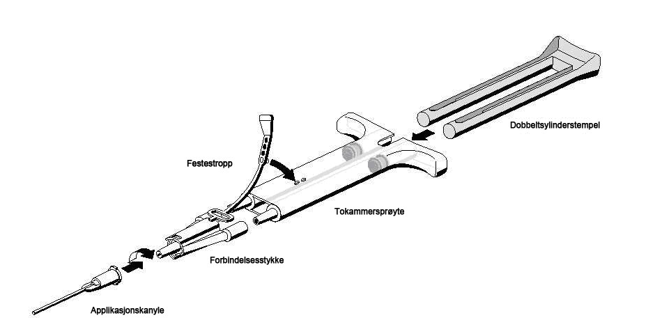 For applikasjon, koble den ferdigfylte tokammersprøyten med tetningsproteinoppløsningen og trombinoppløsningen til et forbindelsesstykke og en applikasjonskanyle. Begge delene finnes i det medfølgende settet med applikasjonsutstyr. Det felles stempelet for den ferdigfylte tokammersprøyten, sørger for at like volumer av de to vevslimkomponentene blir ført gjennom forbindelsesstykket og inn i applikasjonskanylen der de blir blandet og sprøytet ut.