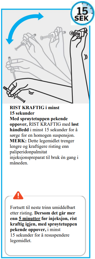 TREVICTA trenger lengre og kraftigere risting enn paliperidonpalmitat injeksjonspreparat til bruk én gang i måneden. Rist sprøyten kraftig, med sprøytetuppen oppover, i minst 15 sekunder inntil 5 minutter før administrasjon (se trinn 2).