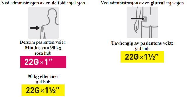 Kanylevalget avhenger av injeksjonssted og pasientens vekt.