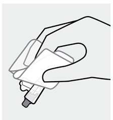 Åpne først kanyleposen ved å rive dekslet halvveis av. Legg det på en ren overflate. Hold deretter sprøyten pekende oppover, vri og dra av gummihetten.