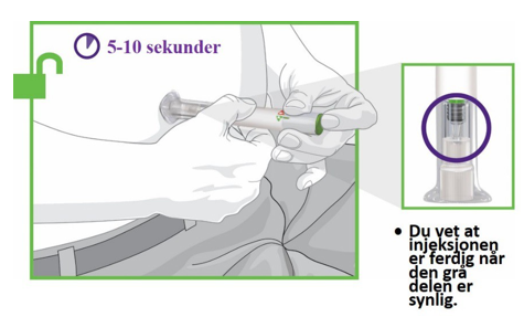 Når du presser inn den grønne injeksjonsknappen vil pennen automatisk føre kanylen inn under huden din, injisere legemidlet og trekke tilbake kanylen etter at injeksjonen er fullført.