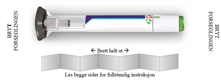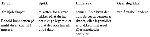 Pennen inneholder deler i glass. Disse skal håndteres forsiktig. Hvis du mister den på en hard overflate, skal du ikke bruke den. Bruk en ny penn til injeksjonen.