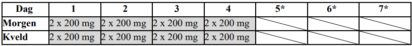 Den vanlige startdosen er 400 mg (to 200 mg tabletter) tatt to ganger daglig (totalt 4 tabletter hver dag) i fire dager etterfulgt av tre dager uten dosering. Se tabell 1.