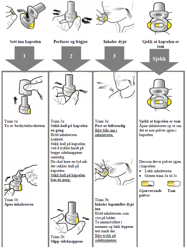 Les instruksjonen i slutten av dette pakningsvedlegget for mer informasjon om hvordan inhalatoren brukes.