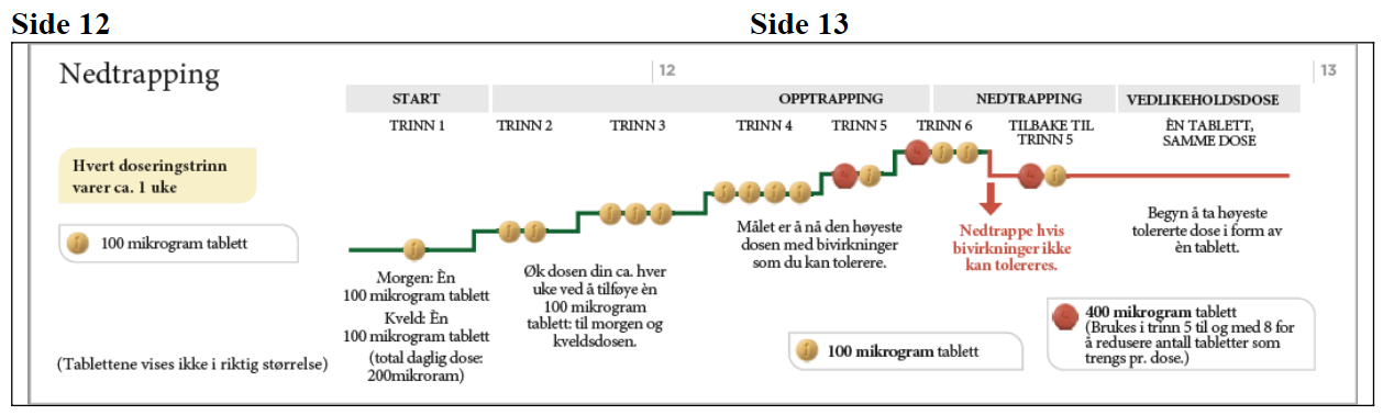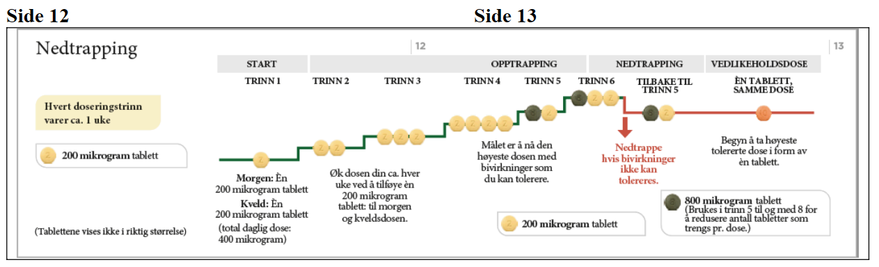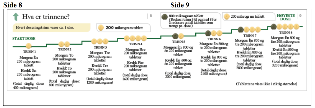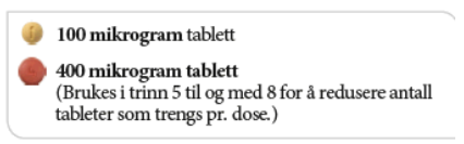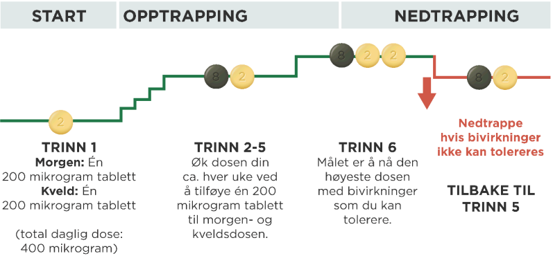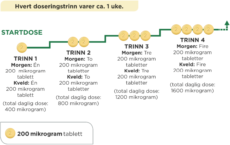Ved hver doseøkning tar du én ekstra 200 mikrogram tablett med morgendosen og én ekstra 200 mikrogram tablett med kveldsdosen. Det anbefales at første inntak av en øket dose skjer om kvelden. Diagrammet nedenfor viser hvor mange tabletter du skal ta hver morgen og hver kveld på de 4 første trinnene.