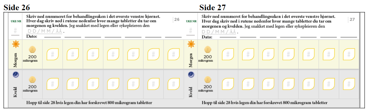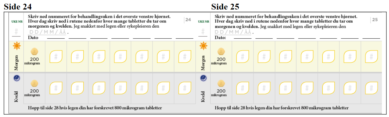 Den første tablettpakningen du får, inneholder lysegule tabletter på 200 mikrogram.