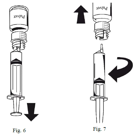 Oppløsningen i sprøyten skal være klar eller svakt opaliserende. Så snart oppløsningen er overført, hold stempelet på sprøyten fast (slik at det peker nedover) og fjern sprøyten fra overføringssettet (Figur 7). Kast det tomme hetteglasset sammen med den hvite delen av overføringssettet.
