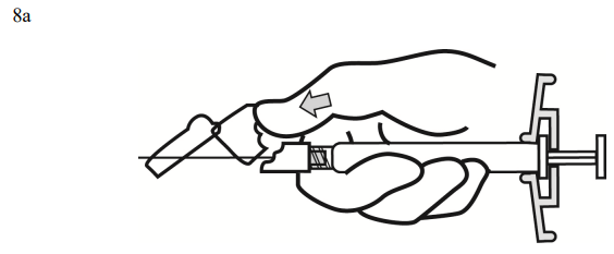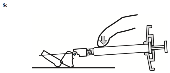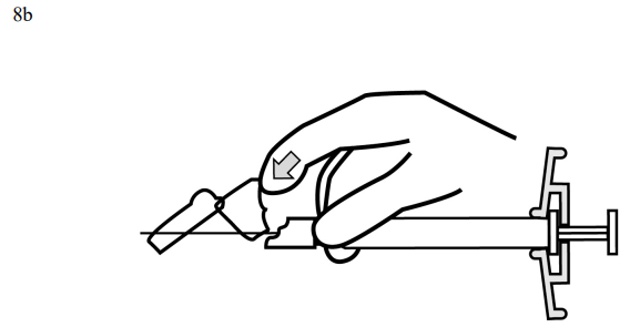 8. Etter fullført injisering aktiveres kanylebeskyttelsessystemet med enten tommelen eller fingeren på en hånd (8a, 8b) eller en flat overflate (8c). Systemet er helt aktivert når det høres et "klikk". Kast sprøyten med kanylen på riktig måte.