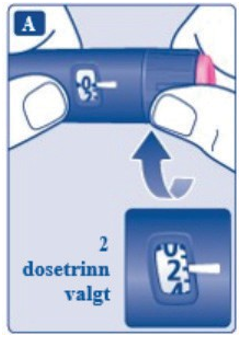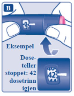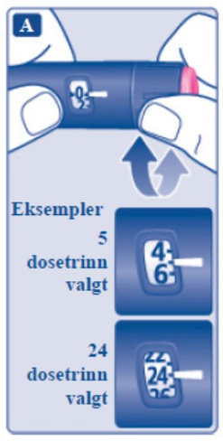 Bruk alltid dosetelleren og dosepekeren for å se hvor mange dosetrinn du har valgt, før legemidlet injiseres.Ikke tell penneklikkene. Hvis du velger og injiserer feil dose, kan blodsukkernivået bli høyt eller lavt. Ikke bruk penneskalaen, den viser kun omtrent hvor mye oppløsning som er igjen i pennen.