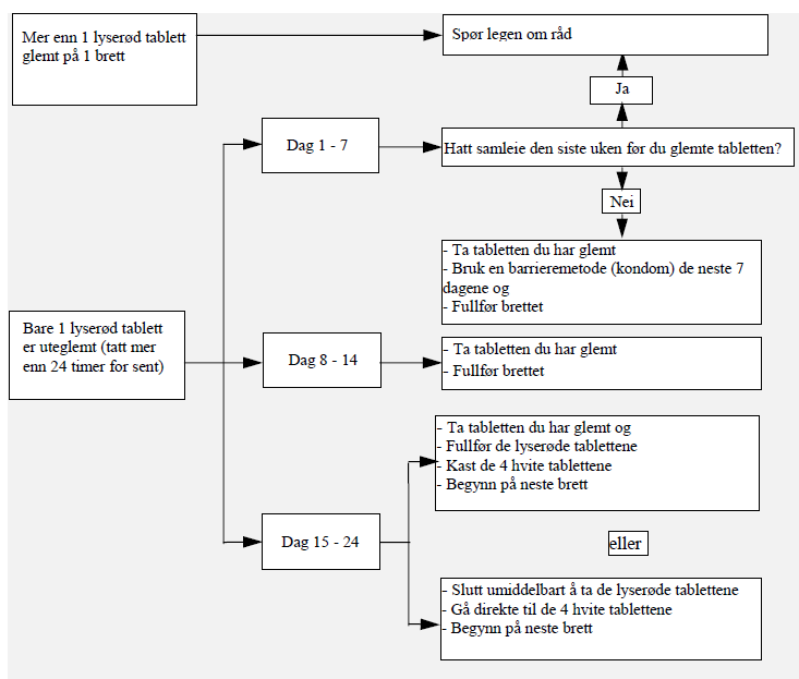 Dersom du har glemt å ta noen av de lyserøde, aktive tablettene på et brett og ikke får en blødning i løpet av placebodagene, så kan dette bety at du er gravid. Du må da rådføre deg med din lege før du fortsetter med neste brett.
