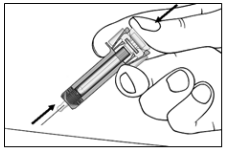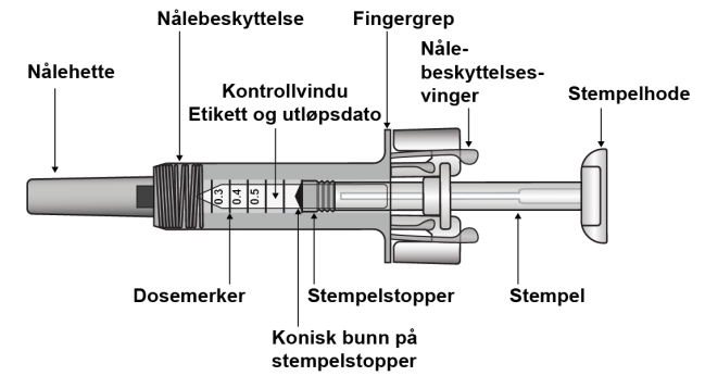 Nålebeskyttelsen dekker til nålen etter injeksjonen for å forhindre nålestikkskader. Dette påvirker ikke den normale funksjonen til sprøyten. Press stemplet sakte og jevnt ned til hele dosen er gitt, og det ikke er mulig å presse stemplet lenger ned. Fjern sprøyten fra pasienten mens du opprettholder presset på stemplet. Nålebeskyttelsen vil dekke til nålen når stemplet slippes løs.