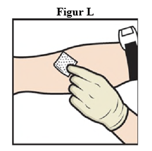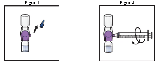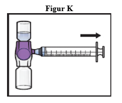 14. Vend systemet opp ned (hetteglasset med ADZYNMA er nå øverst). Trekk den rekonstituerte oppløsningen opp i sprøyten ved å trekke stempelet sakte tilbake (figur K).