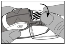 Det skal aldri være mer enn 2 deler av foliestrimmelen i sidekammeret da de kan stoppe til inhalatoren. Trekk strimmelen forsiktig vekk, som vist ovenfor, og kast den på en sikker måte.