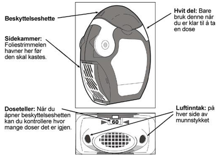 Husk: Du må bare flytte den hvite delen av munnstykket når du er klar til å inhalere en dose av legemidlet. Dersom du klargjør en dose uten å inhalere vil dosen gå tapt.