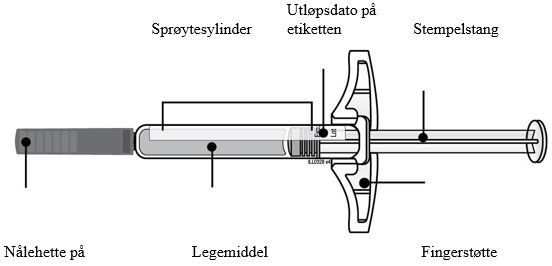 Hver pakke inneholder 1, 2, 4 eller 6 40 mg ferdigfylte sprøyter til engangsbruk (med blå stempelstav).