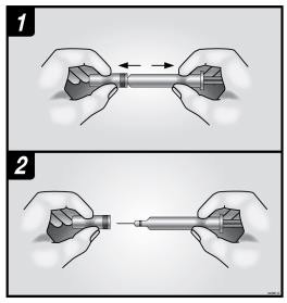 Trekk forsiktig beskyttelseshetten fra kanylen uten å vri slik bilde 1 og 2 viser, slik at du unngår å bøye kanylen.