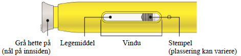 Ikke fjern den grå hetten fra den ferdigfylte pennen før du er klar til å injisere.