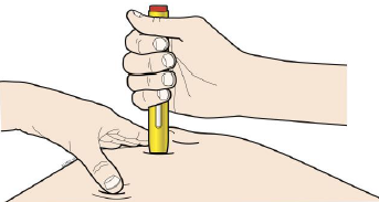 G. Fortsett å holde huden strekt eller klemt. Ta av hetten og trykk den ferdigfylte pennen ned mot huden i 90 graders vinkel.