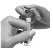 Ta av sprøytehetten Sprøyten har en hvit hette av en type som viser om den har vært åpnet. Forsikre deg om at hetten er hel og ikke har vært åpnet. Bruk ikke sprøyten hvis det ser ut som den har vært åpnet. Hold sprøyten slik at den hvite hetten vender opp. Bøy hetten i en rett vinkel til den knekker av. Ikke berør koblingsporten. Ikke skyv på stempelet. |
