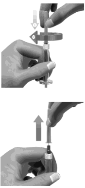 Trekk kanylen ut Hold huden stramt utstrukket eller klem sammen huden rundt injeksjonsstedet, og trekk kanylen ut. Hold en desinfeksjonsserviett på injeksjonsstedet, dersom du bruker dette. Sett et plaster på injeksjonsstedet hvis det er nødvendig. |