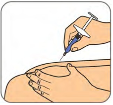 Klem og hold forsiktig fast det rengjorte hudområdet med en hånd. Hold den ferdigfylte sprøyten i en 45 graders vinkel mot huden. Med en rask, kort bevegelse, stikkes kanylen helt inn i huden.