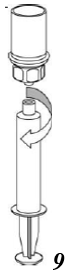 9. Når oppløsningen er overført til sprøyten tar du et godt tak i sprøytesylinderen (hold sprøyten med stempelet nedover) og kopler det gjennomsiktige Mix2Vial-settet fra sprøyten.