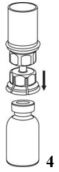 4. Plasser hetteglasset med pulver trygt på en jevn og fast overflate. Snu hetteglasset med oppløsningsvæsken med Mix2Vial-settet festet på opp ned, og press spissen på den gjennomsiktige adapterdelen rett ned gjennom proppen til hetteglasset med pulver.