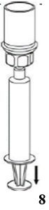 9. Når oppløsningen er overført til sprøyten tar du et godt tak i sprøytesylinderen (hold sprøyten med stempelet nedover) og kopler det gjennomsiktige Mix2Vial-settet fra sprøyten.
