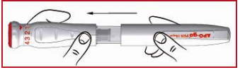VIKTIG: Ikke trekk i dosehjulet med rød topp (se 1) før du har innstilt doseringen (se ”Valg av korrekt dose”)Festing av nålen