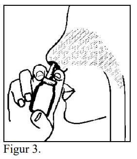 4. Før tuppen av munnstykket inn neseboret som vist i figur 3. Spray én gang (eller flere dersom legen din har bedt deg om det). Spray inn i det andre neseboret på samme måte. Merk: Det er ikke nødvendig å puste inn mens du sprayer.