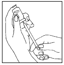 Snu hetteglasset opp ned. Trekk deretter stempelet varsomt tilbake for å trekke legemidlet fra hetteglasset inn i sprøyten. Pass på så du ikke trekker stempelet med proppen helt ut av sprøyten ved et uhell. Dersom du ved et uhell trakk stempelet med proppen helt ut, må du kaste hele dosen ettersom den ikke lenger er steril. Gjør klar en ny dose (og start på nytt fra trinn 1).