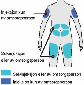 B. Velg injeksjonsstedB1. Anbefalte injeksjonssteder er: