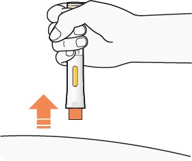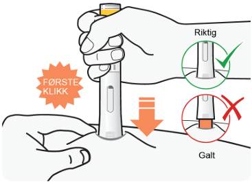 Trykk den ferdigfylte pennen bestemt mot huden til du ikke ser den oransje nålebeskyttelsen, og hold den fast slik.