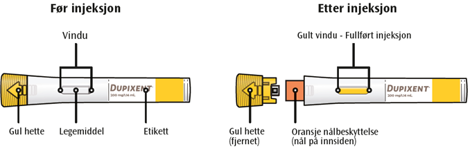 Dette er en ferdigfylt penn til engangsbruk. Den inneholder 200 mg Dupixent for injeksjon under huden (subkutan injeksjon). Du må ikke sette en injeksjon på deg selv eller andre med mindre du har fått opplæring fra helsepersonell. Hos ungdom som er 12 år eller eldre, anbefales det at Dupixent gis av eller under oppsyn av en voksen. Hos barn under 12 år bør Dupixent gis av en omsorgsperson.