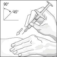 5. Når kanylen er fullstendig innstukket i huden skal du slippe huden som du holder i. Hold sprøyten med den ledige hånden for å stabilisere den. Press deretter stempelet for å injisere alt legemidlet med en langsom, jevn hastighet (se figur 4).