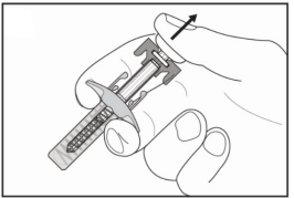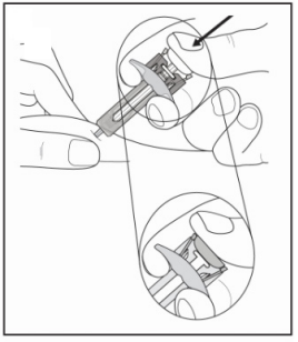 Hold sprøytens fingerflens som vist. Trykk stempelet ned så sakte som mulig slik at stempelhodet når helt inn mellom kanylebeskyttelsesvingene.