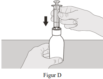 Steg 3 Hell forsiktig 79 ml renset vann eller vann til injeksjonsvæsker inn i legemiddelflasken (se figur D). |