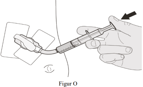Skyll magesonden med 10-20 ml vann rett etter å ha gitt dosen med Evrysdi (se figur O). Gå til steg E for rengjøring av sprøyten.